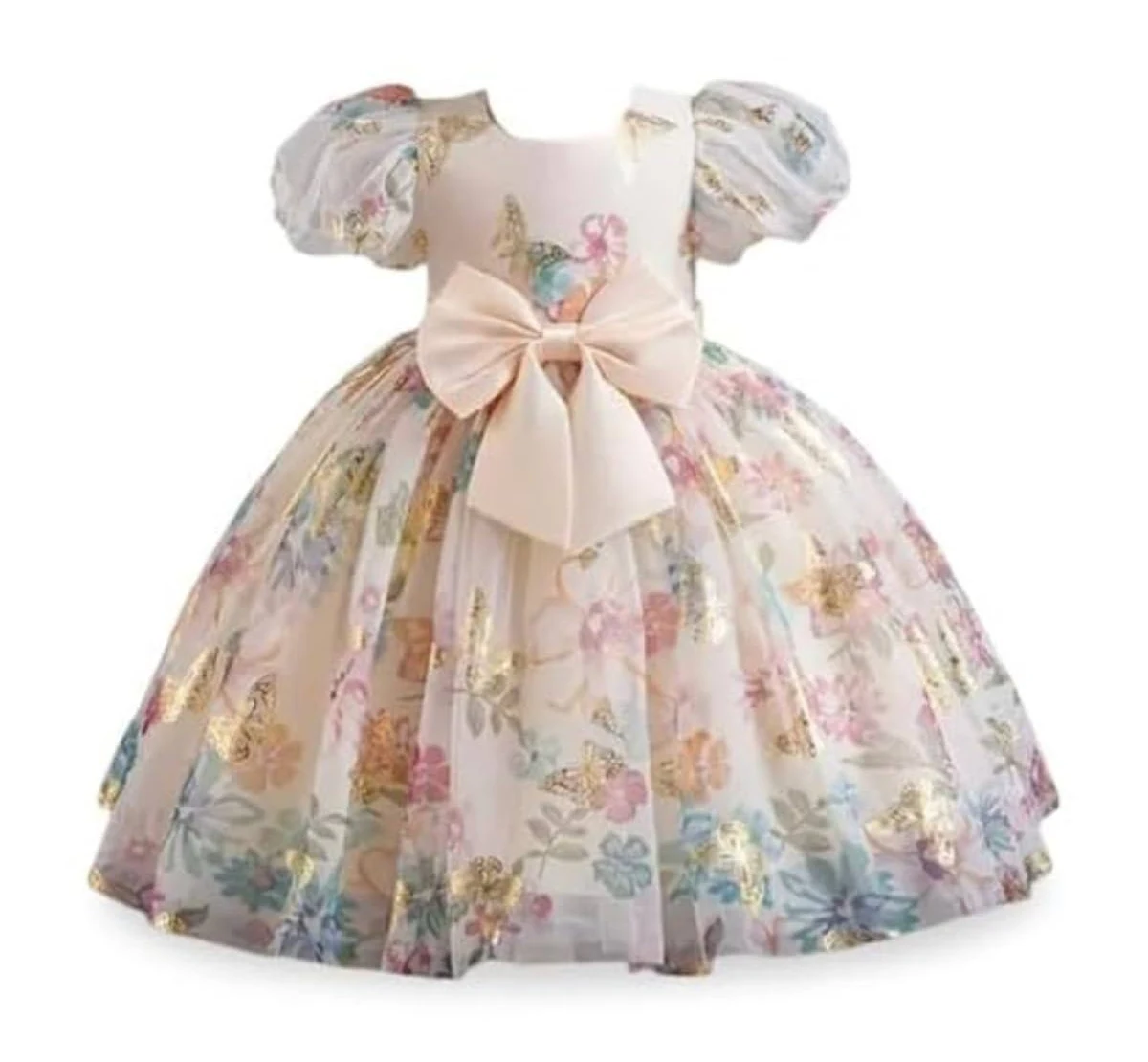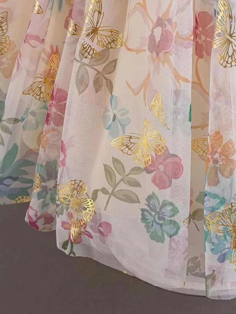 Designed to make your baby girl feel like a true princess, this dress features a soft floral and butterfly-inspired print that looks elegant yet playful. The gentle pastel shades and beautiful details make it perfect for daytime functions as well as evening celebrations. Whether it’s a family event or a birthday photoshoot, this dress adds that extra magical touch.